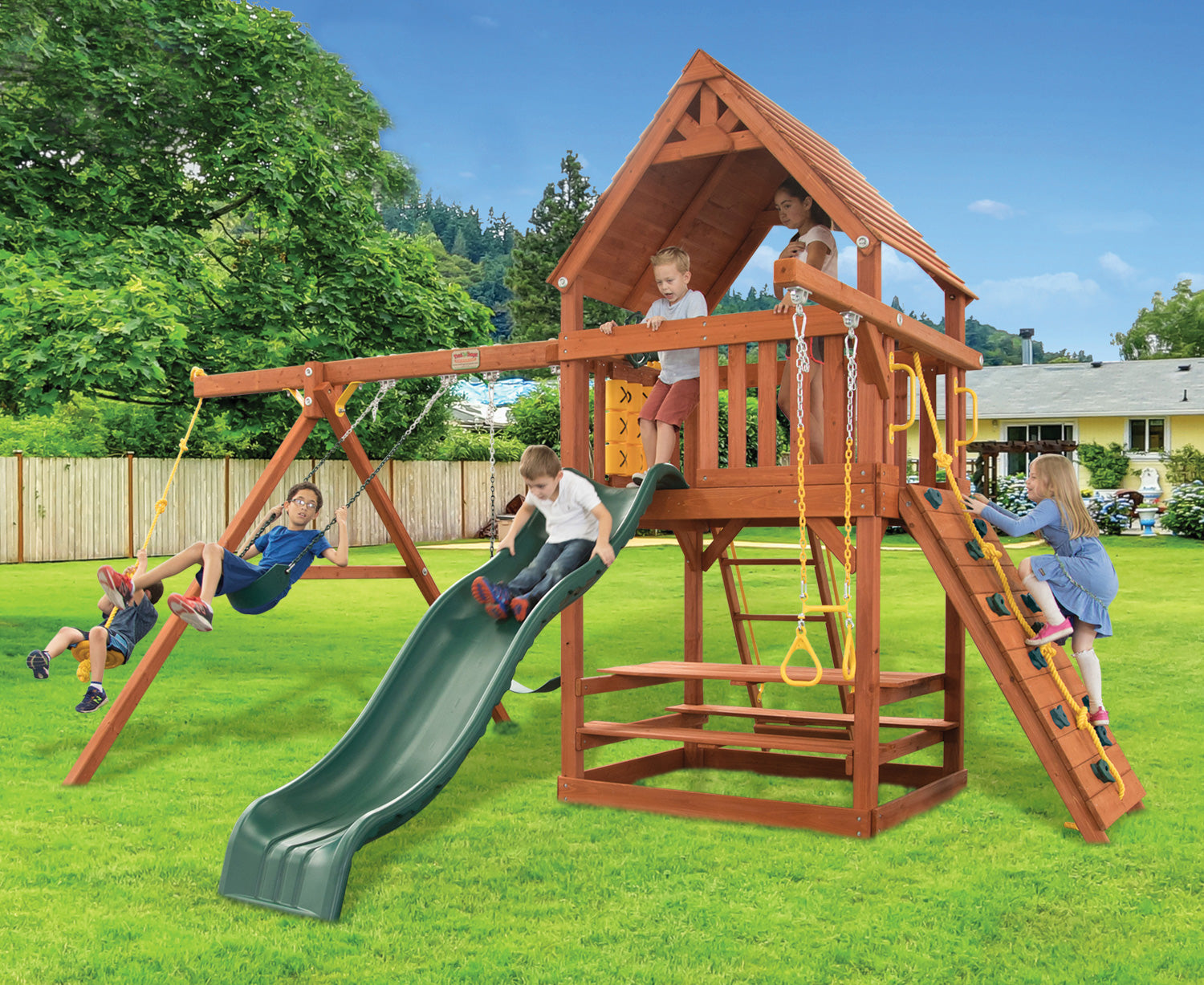 - Full Width Rock Wall has 10 durable green rock holds coupled with a yellow Climbing Rope